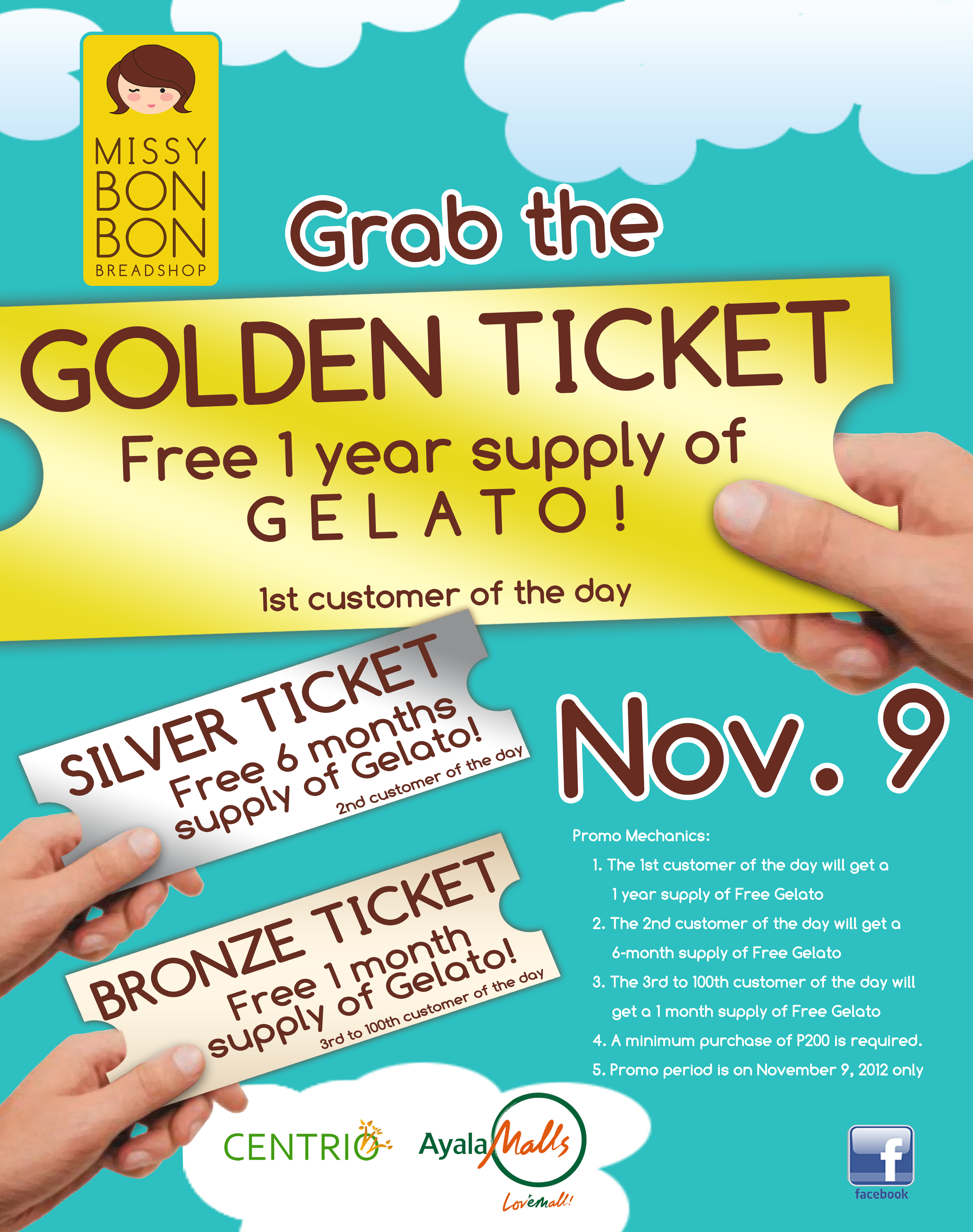 Here’s a fun reason for you to be the very first in line when Centrio Ayala Mall opens on November 9, 2012. Missy BonBon Breadshop Centrio Ayala Mall is bringing back the exciting Golden Ticket contest! The Missy BonBon Golden Ticket contest entitles the winners free supplies of yummy gelato 🙂