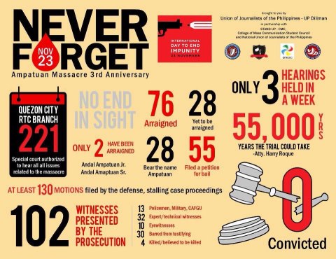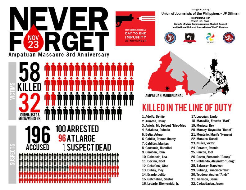 It’s been 3 years today. It’s been three years since that November 23, 2009 Maguindanao Massacre that claimed 58 lives, including 32 journalists. It’s been 3 years, several suspects have already been arraigned, hundreds have already been arrested, hundreds more have already been presented as witnesses but NONE have been convicted.