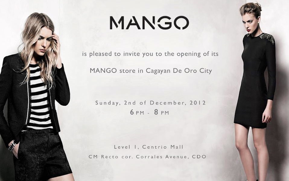 International brand MANGO is set to open its Ayala Centrio Cagayan de Oro branch on Sunday, December 2, 2012, 6PM at Level 1, Centrio Mall. MANGO, an international clothing design and manufacturing company, will finally open its very first flagship store (and not just an outlet store) in Cagayan de Oro City, Northern Mindanao, Philippines and I’ll be there! ๐