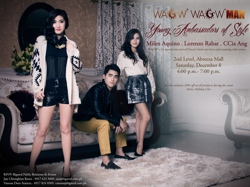 Young and stylish Dabawenyos will be launched as What A Girl Wants (WAGW) Davao Young Ambassadors of Style 2012 on Saturday, December 8, 2012, 4 PM to 7 PM at the WAGW Ayala Abreeza Mall branch.