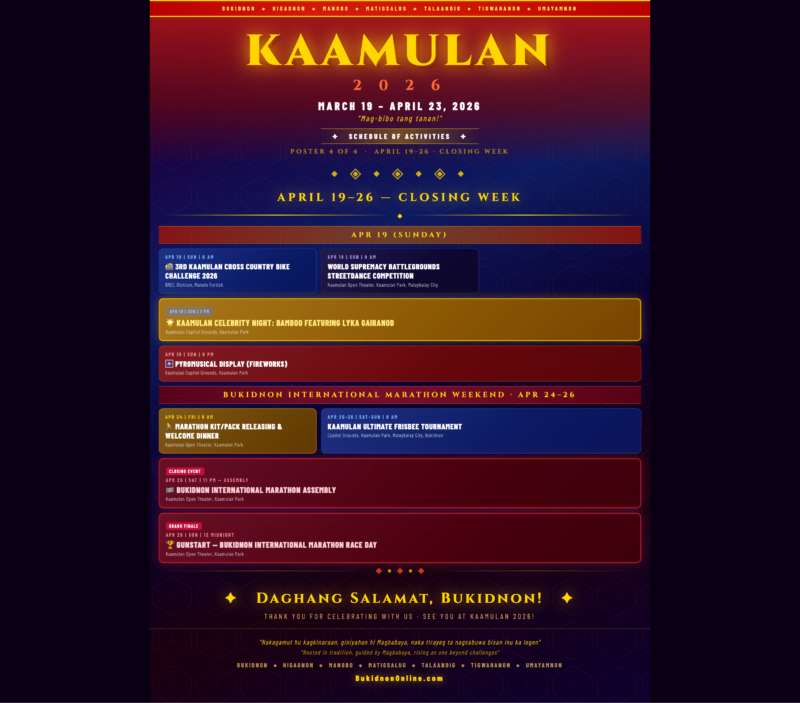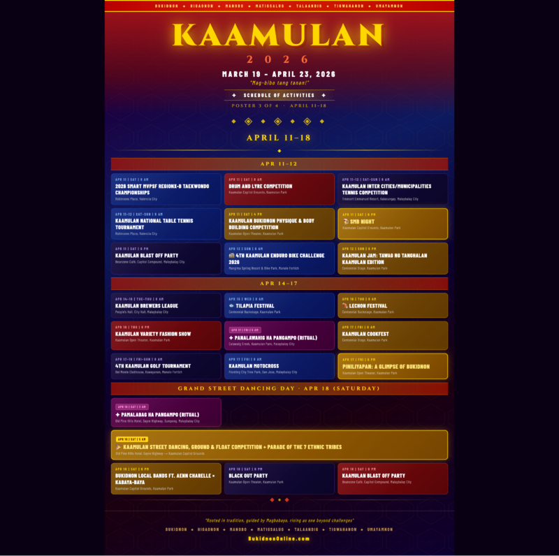 | MAR 23–28 | MON–SAT | 8 AM | KAAMULAN BASKETBALL TOURNAMENT 2026: 30 & UNDER | Mar 23–24 (Mon–Tue): Damulog | Mar 25 (Wed): Valencia | Mar 26 (Thu): Kibawe | Mar 27 (Fri): Manolo Fortich | Mar 28 (Sat): Sports Complex, Laguitas, Malaybalay City |